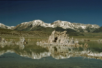 Vom Yosemite NP über den Tioga Pass kommend fährt man direkt auf den Mono Lake zu. Kristalltürme ragen aus dem salzhaltigen Wasser wie Säulen empor, im Hintergrund die Bergrießen der Sierra Nevada mit Gipfeln bis über 4000 m hoch und die Bergkämme der White Mountains.