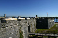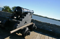 Coquina wurde verwendet, weil es in der Gegend kein anderes Steinmaterial gab. Der damit einhergehende Nebeneffekt wurde positiv mitgenommen: Coquina ist ein weiches Material, das bei Auftreffen von Kanonenkugeln nicht zersplittert sondern wie eine Knetmasse die Kugel aufnimmt und abbremst. Kanonenkugeln konnten so ca 2-3 Fuß (knapp einen Meter) in das Mauerwerk eindringen, da die Mauern aber an der dünnsten Stelle rund 2,5 Meter dick waren, hatte dies auf die Festigkeit des Forts keinen Einfluss. Das Fort war von den Spaniern als reines Schutz-Fort der Bevölkerung von St. Augustine erbaut. Bei der Belagerung in 1702 durch die Engländer befanden sich neben den Soldaten ca. 1500 Einwohner von St. Augustine innerhlab der Mauern des Forts. Die Räume waren der Bevorratung von Lebensmitteln, Waffen und Schießpulver vorbehalten, der Graben rings um das Fort diente nicht als Wassergraben zum Schutz sondern als Weidefläche für das Vieh, das zur Ernähung der schutzsuchenden Bevölkerung bei einer Belagerung diente. Die Engländer konnten also das Fort weder einnehmen, noch zerstören. Nach 51 Tagen kam die Rettung aus Havanna in Form der dort stationierten Flotte unter der spanischen Krone, und die Engländer mussten abziehen. Doch vorher brannten sie St. Augustine bis auf die Grundmauern nieder und die Stadt musste komplett neu aufgebaut werden. Nach dem Neuaufbau begann man, einen Festungswall rings um die Stadt zu ziehen, um Agressoren aus der Stadt fern zu halten. Im Jahre 1739 wurde Spanien von England der Kolonialkrieg erklärt und im Jahre 1763 ging das Fort im Rahmen der im Pariser Frieden ausgehandelten Besitzzugehörigkeiten in britischen Besitz über. Die Engländer benutzten das Fort aber nicht nur zum Schutz vor belagerungen, sondern wollten auch ihre Truppen in dem Fort stationieren. So wurde das Fort teilweise umgebaut und in die Lagerräume Holzböden eingezogen. Nachdem im Ameriaknischen Unabhängigkeitskrieg sonst alle Kolonien auf den Amerikanischen Kontinent für die Engländer verloren waren, blieb den Engländern nur noch Florida, das sie an die Spanier, gegen diese ebenfalls Krieg geführt wurde, im Pariser Frieden von 1783 wieder abtraten. 1821 verkaufte Spanien die Kolonie Florida an die vereinigten Staaten von Amerika, das Fort hatte aber für die Amerikaner nicht mehr die Bedeutung. 1862 wurde das Fort dann zum Gefängnis umgewandelt und im Jahre 1900 als National Monument unter den Schutz des National Park Service gestellt. Die Besichtigung des Forts war seht interessant und die Führerin hat die Geschichte und Geschichtchen sehr interessant und anschaulich erzählt. Anschließend sind wir nochmals durch das Historic District geschlendert, aber ohne weitere Museen anzuschauen.