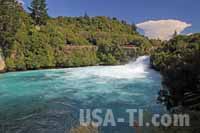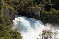 Wir beziehen das neue Motel, sogar mit einem heißen privaten Pool am Zimmer angeschlossen, den wir allerdings nicht nutzen. Im Gegenteil, wir liegen beide mit Fieber im Bett und schwitzen die Laken durch. Hoffentlich wird das bald mal wieder besser ! 8. Tag: Von Rotorua nach Taupo Mein Fieber ist wieder runter, Sina hat noch eine erhöhte Temperatur. Also beschließen wir, es ab jetzt weiter ruhig angehen zu lassen und hetzen nicht frühmorgens los, um den ca. 20 Minuten entfernten Geysir um 10:15 Uhr hochgehen zu sehen sondern schlafen aus und beginnen mit einem Caramel Latte beim Starbucks. Der Weg nach Taupo geht über schöne, hügelige landschaft, immer einen oder mehrere Vulkane im Blickfeld - schön, aber nicht spektakulär. In Taupo angekommen beziehen wir direkt unser Zimmer und Sina legt sich auch gleich fiebrig hin. Ich hingegen fahre nochmals los und schaue mir die Umgebung an. An den Huaka Falls mache ich Station. Hier verengt sich das Flußbett und das kristallblaue Wasser schießt schäumend das Gefälle hinunter. Der eigentliche Wasserfall ist nicht besonders hoch, aber dank der Gesamtstrecke und der Umgebung ein sehenswertes Schauspiel.