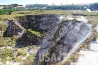 Weiter geht es zu den Craters of the Moon. Erstaunlicher weise kosten diese nur $6 eintritt und nicht, wie mittlerweile ewohnt, $35. Die Craters of the Moon ist ein geothermisches Feld, durch das sich einzelne Krater und kleine Schluchten zieht. Überall steigt Dampf auf und, wie soll es anders sein, die faulen Eier sind auch wieder da. In den Kratern kochen entweder Wasserpfützen oder Schlamm, alternativ zischt der Dampf direkt zu kleinen Öffnungen mit 140°C aus der Erde heraus. Durch das Feld führt ein ca. 45 minütiger Rundweg, meist auf Holzplanken, damit sich nicht wegen der Hitze aus dem Boden die Schuhsolen ablösen - oder wegen der Neuseeländer, die am liebsten Barfuß oder nur in Socken spatzieren gehen. Alles in allem schön, nur den Mond hätte ich mir nicht so mit Farnen und einer Art Heidekraut bewachsen vorgestellt.